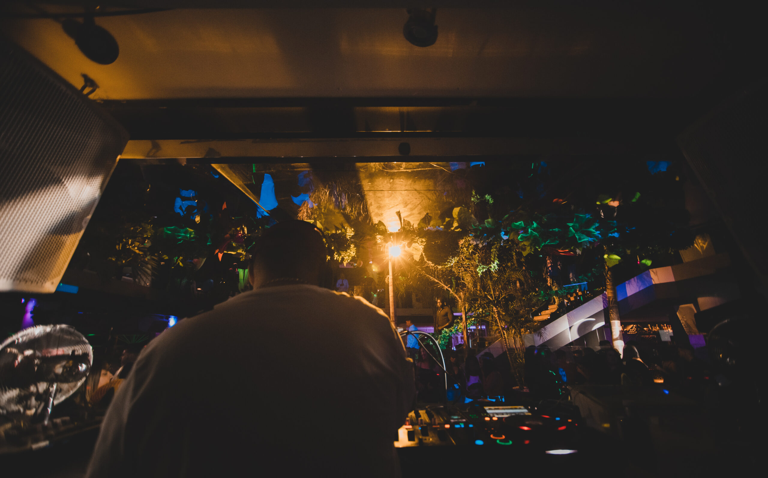 En cabina, trabaja con dos CDJs y sampler, lo que le permite improvisar, jugar y transformar cada sesión en un show personal y único.